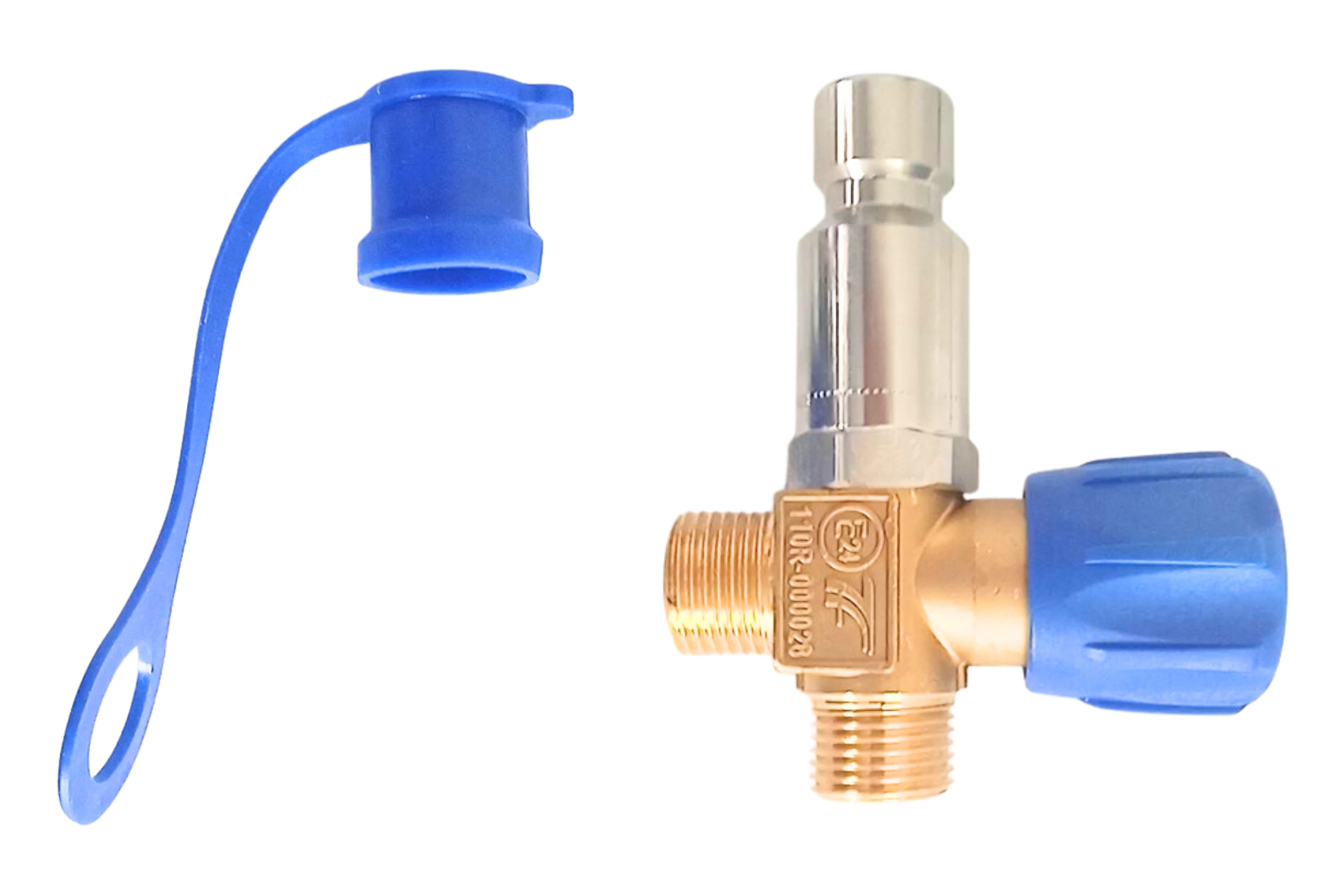 Válvula de llenado manual fabricada en latón forjado en caliente, adaptada para trabajar con GNC, equipada con válvula antirretorno y tapón.